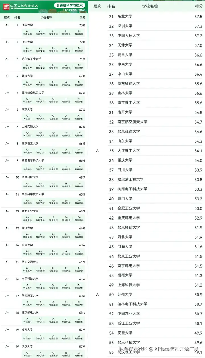 2025中国大学计算机专业排名一览表出炉啦! XPlaza信创开源广场 2025-06-26 360 阅读1分钟 2025年中国大学计算机科学与技术专的学校排名出炉啦,高考学子可以参考哦! 信息来源于软科 前 10 分别是清华、浙大、哈工大、北大、北京航空航天大学、南京大学、上海交通大学、北京理工大学、西安电子科技大学和华中科技大学。 毋庸置疑,IT行业仍是当下就业前景最广阔的行业之一。 国家统计局数据显示,2024年IT行业平均薪资高达238966元,连续9年稳坐榜首。 信创开源知识,尽在XPlaza!