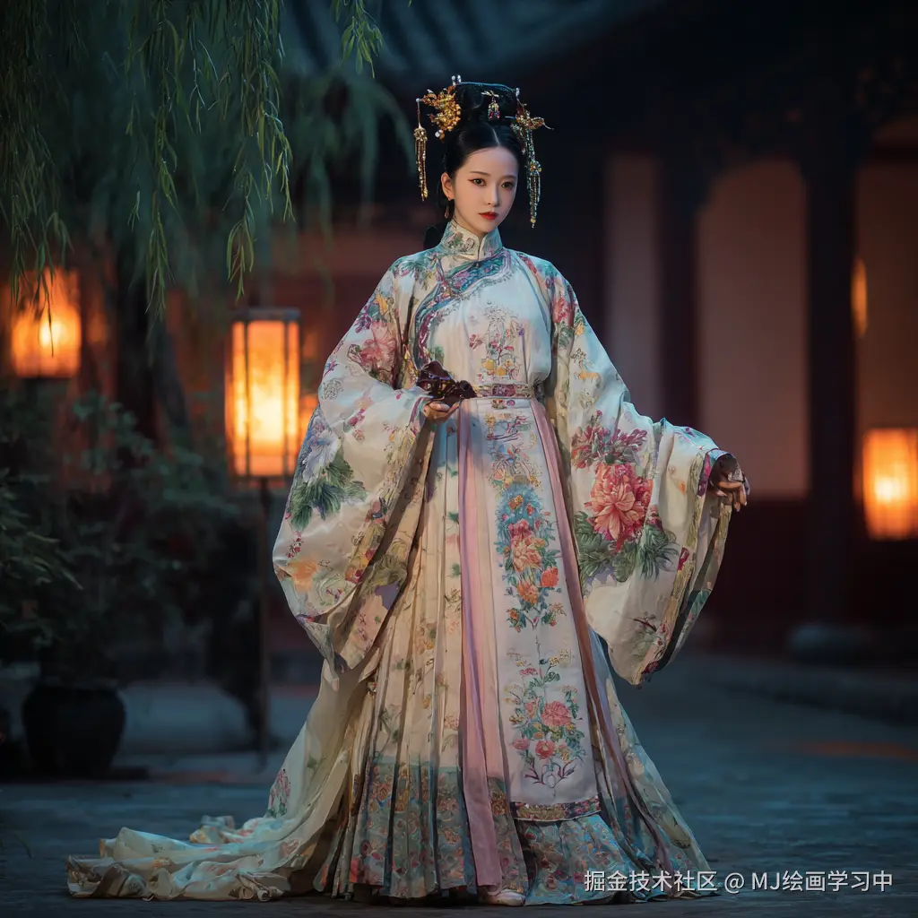 提示词正文:陈圆圆全身肖像,明末清初传奇美人,优雅立于黄昏时分的古典中式庭院,身着奢华而优雅的汉服:柔和水粉色丝绸袄裙配精致花卉刺绣(牡丹/莲花纹样),飘逸广袖,高领设计,腰间系丝质绦带,裙摆及踝,头戴精美发饰(玉簪、珍珠簪、金步摇),妆容淡雅,神情温柔忧郁,手持琵琶。空灵月光,柳树柔影,石灯笼微光,薄雾缭绕,复古哑色调(柔粉、灰绿、深蓝、象牙白、金饰点缀),丝绸与刺绣高细节纹理,中国古典宫廷画风格(如顾恺之或唐寅笔意)融合浪漫主义,戏剧性电影灯光,8k分辨率,杰作,历史考究。 --ar 2:3 --style raw --v 6.0