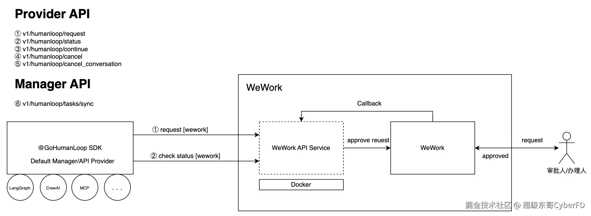 GoHumanLoop提供了一套统一的 API 接口,通过API Provider对外提供。gohumanloop-wework实现了API Consumer的功能,通过API Provider来获取审批相关的信息,并且通过企业微信 WeWork API 实现了与用户的企业微信应用进行交互,发送审批请求和获取审批事件回调等。