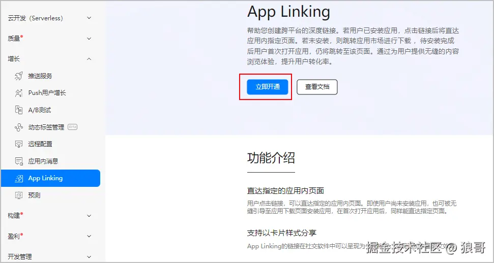 在左侧导航栏中选择“增长 > App Linking”,进入App Linking页面,点击“立即开通”。