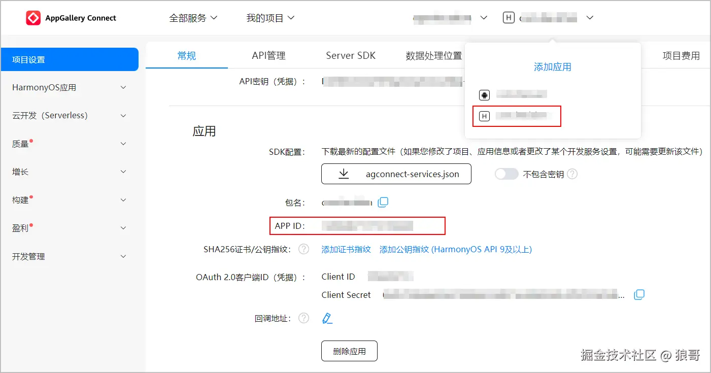 进入“项目设置 > 常规”页面,选择创建的HarmonyOS应用,查看应用的APP ID,后续开发需要使用该ID。