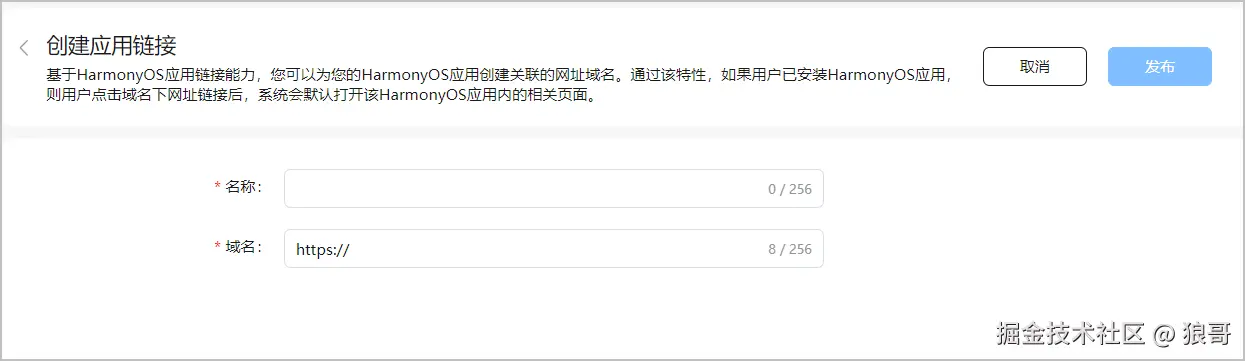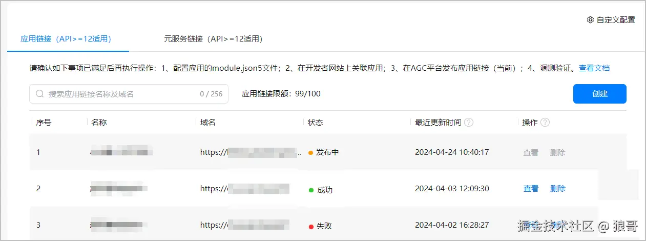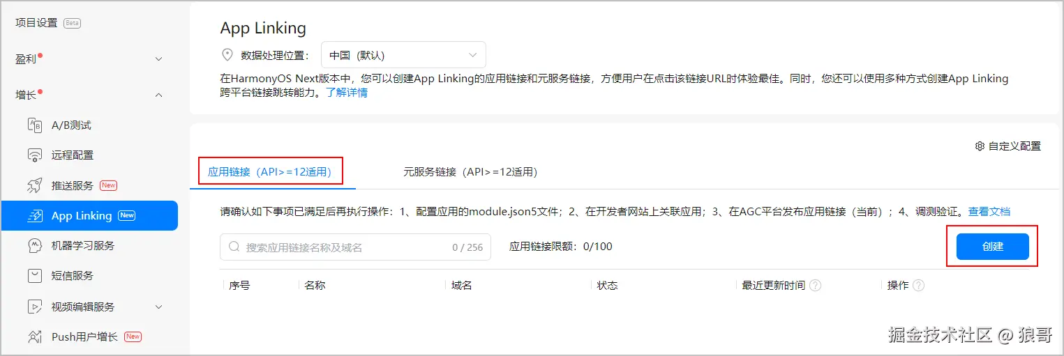 在左侧导航栏中选择“增长 > App Linking”,选择“应用链接(API>=12适用)”页签,点击“创建”。
