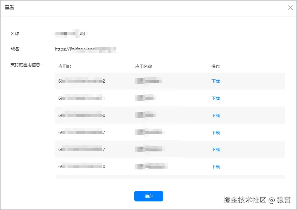 如果域名的配置文件中有应用存在本项目中,则发布成功,点击“查看”可显示该域名关联的应用信息。