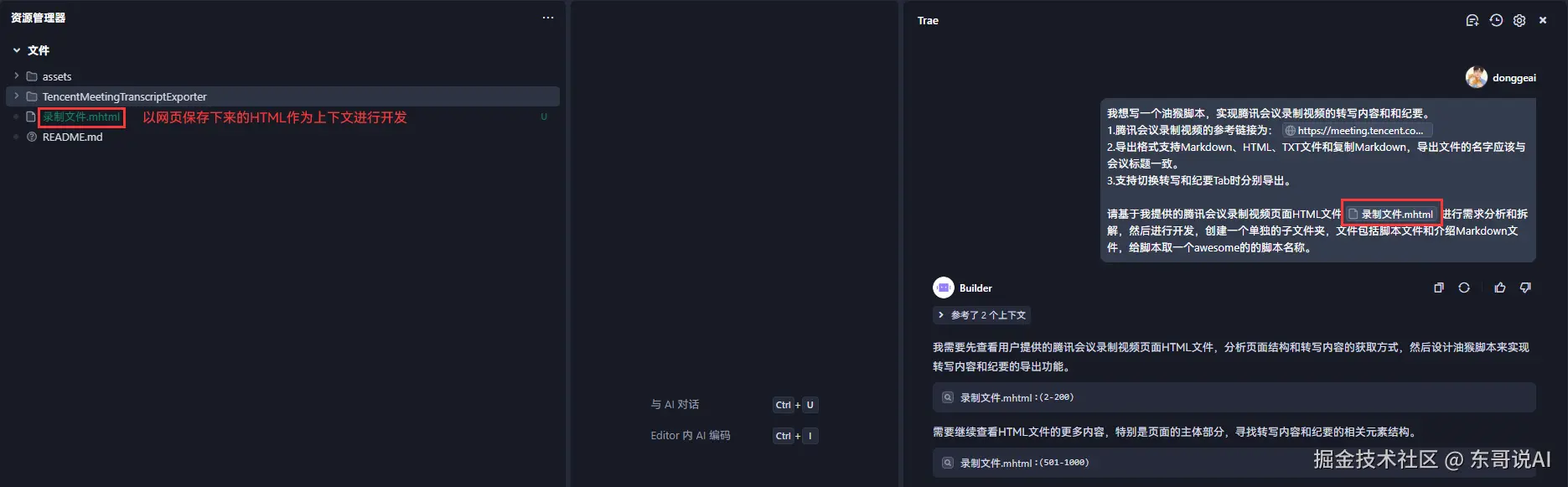 此时有一个更好的方法:直接保存腾讯 会议录制 转写页面到本地 HTML 文件中,在使用Trae进行开发的时候将HTML文件内容作为上下文, 大模型 便可以根据HTML内容和结构进行自动寻找匹配的元素,而不需要再人为指定。