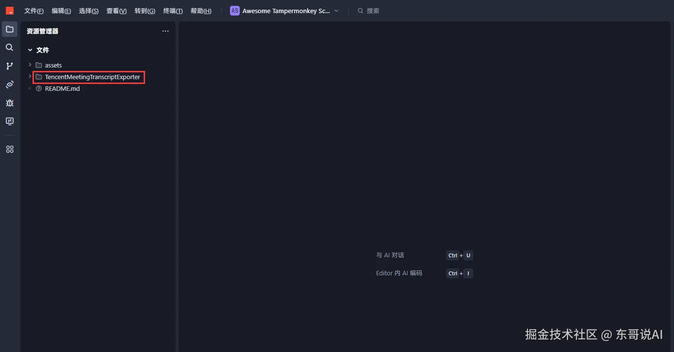 新建一个项目文件夹(例如Awesome Tampermonkey Scripts),使用Trae打开项目目录,项目专门用来存放后续开发的油猴插件。