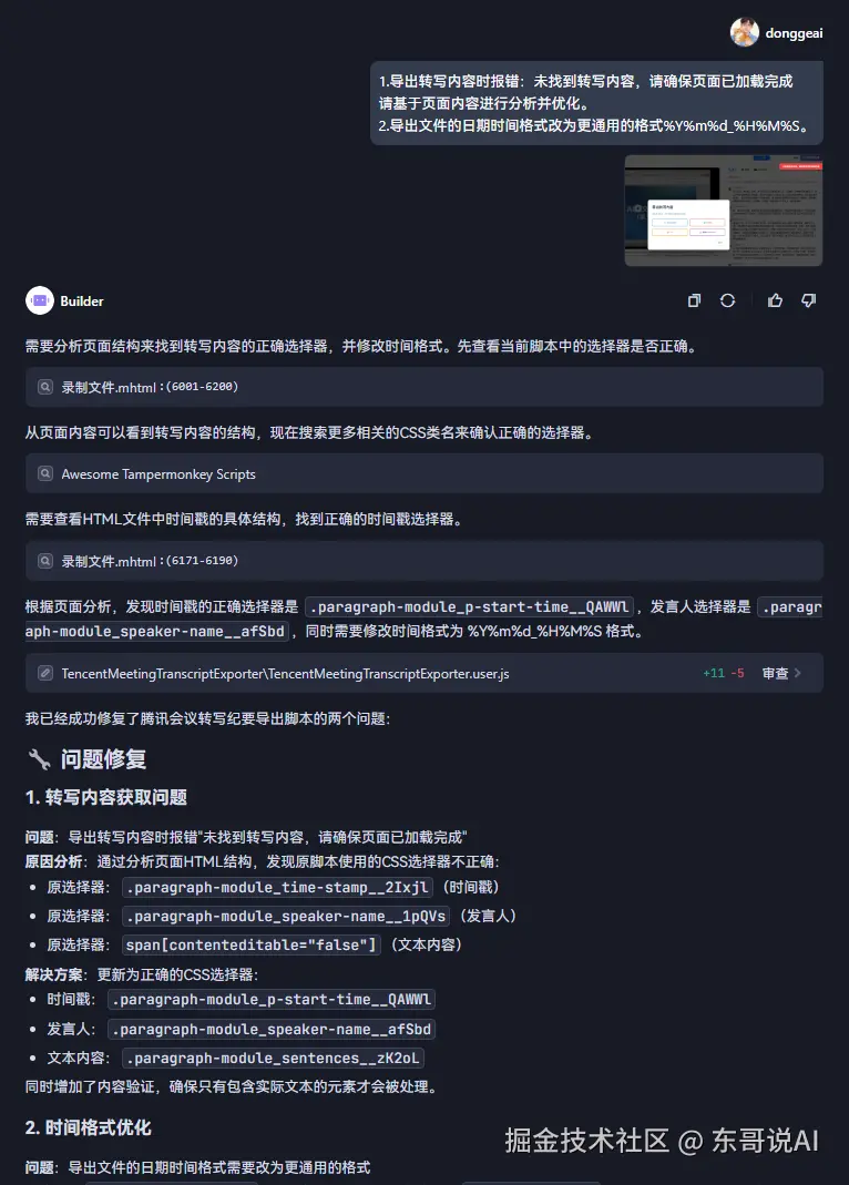 Trae的分析和解决办法还是让人有点惊喜:直接分析出了类似飞书妙记脚本实用的滚动加载的方式来获取全部内容,并在腾讯会议转写的场景下也通过滚动加载来获取完整的转写内容。不得不说,AI确实强,精准分析和解决问题的能力都远胜于我!