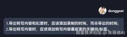 实际执行时,遇到了只能导出转写纪要、无法导出转写内容的情况,可能是转写内容太长了,于是让其进行优化: