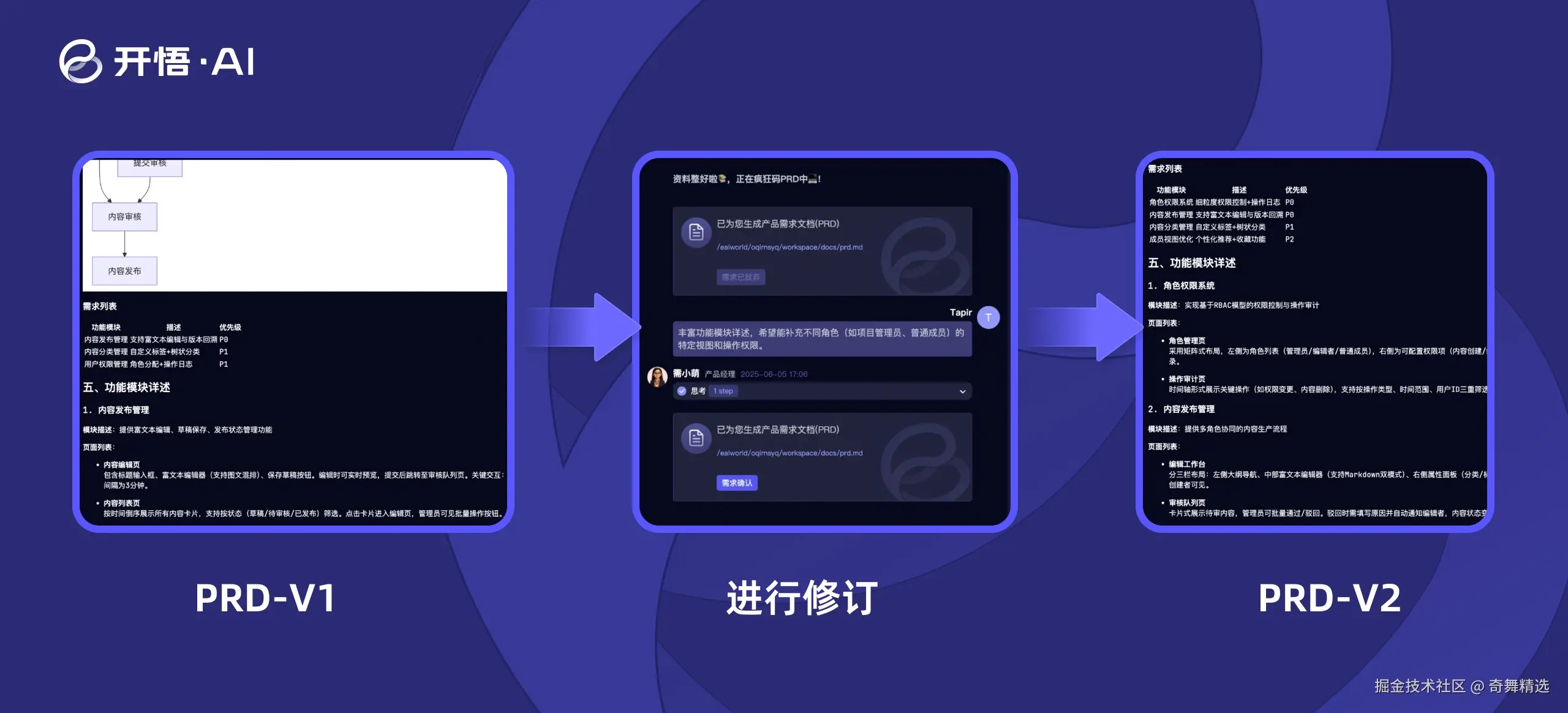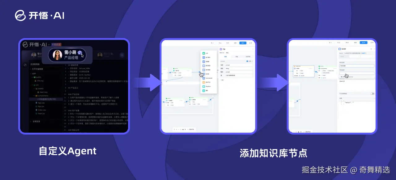 开悟AI 开放 Agent 生态体系,支持用户定制专属Agent:针对现有 Agent,可灵活编排工作流 —— 例如在产品经理的流程中加入私有知识库节点,实现PRD产出的精准性与场景适配性。