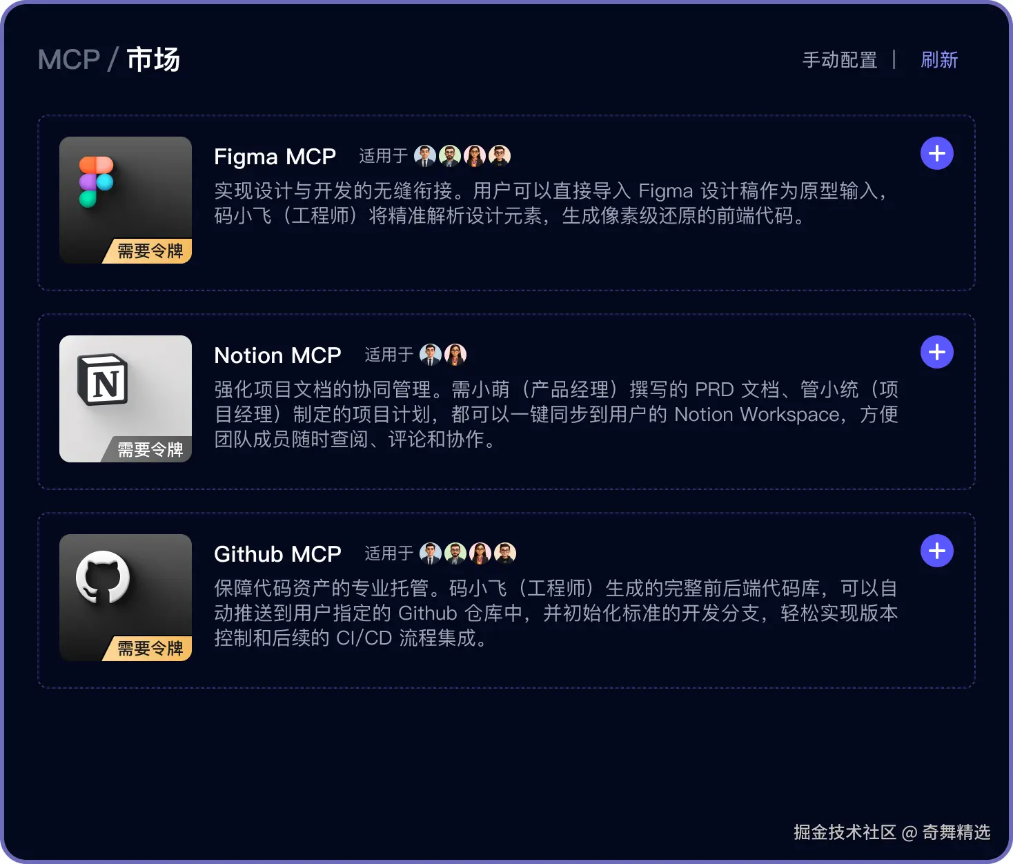 - Figma:实现设计与开发的无缝衔接。用户可以直接导入 Figma 设计稿作为原型输入,码小飞(工程师)将精准解析设计元素,生成像素级还原的前端代码。