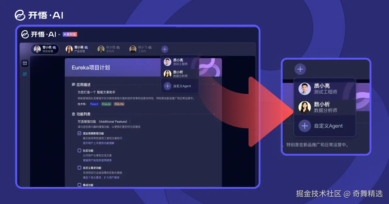 此外,开悟AI 支持对 AI Team 进行全维度自定义:既可添加「质小亮:测试工程师」「数小析:数据分析师」等预置 Agent,也能自定义其名称、头像及专属技能,使 AI 协作体系深度贴合业务场景,彻底实现「严肃编程」。
