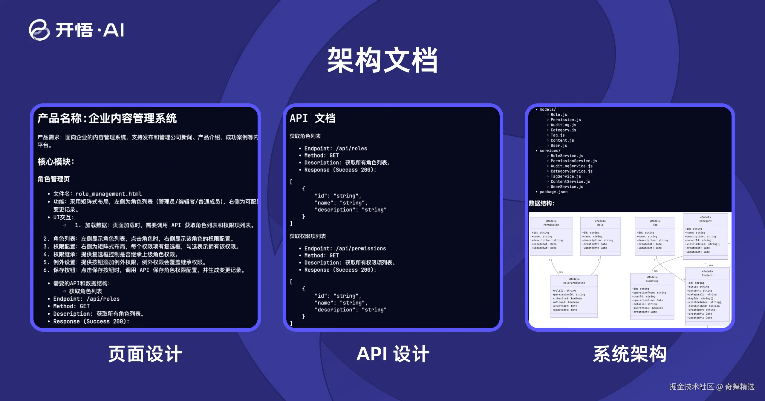 - 构大程 (架构师):负责设计出稳健、高效、可扩展的技术架构,并细化为具体的页面设计、API 设计和系统架构文档。