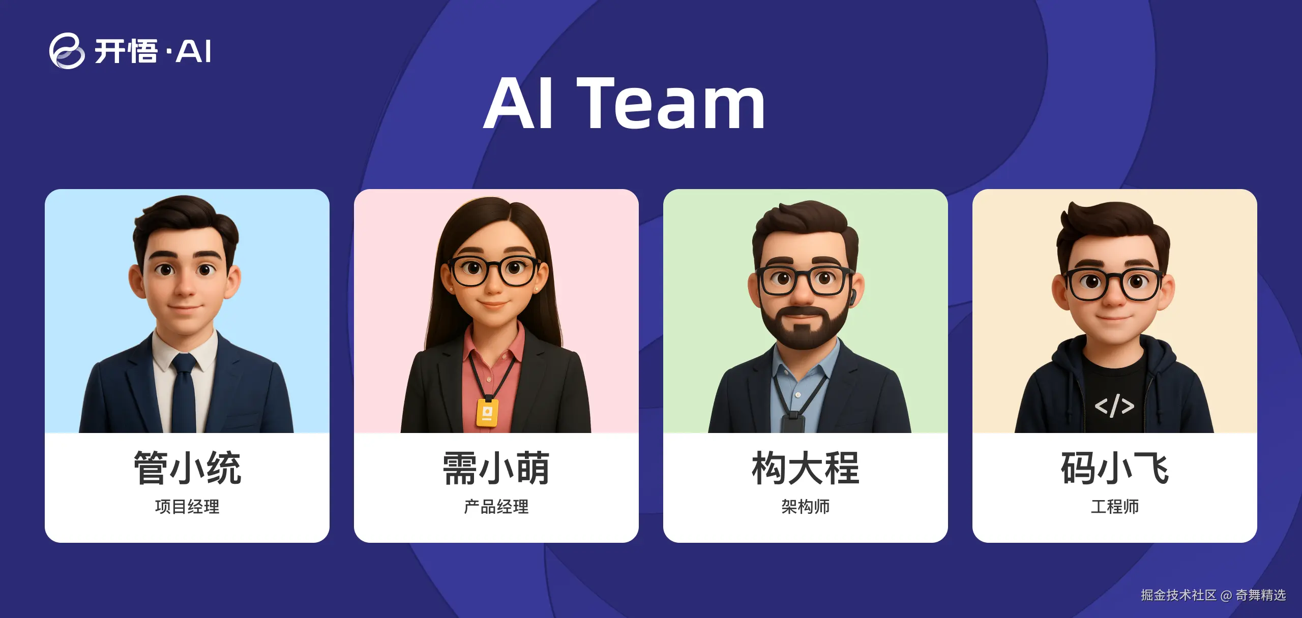 其次,针对「专业度不足」的问题,开悟 AI 组建了一个 AI Team 来服务用户,以此解决各阶段产出专业化程度不足的难题。就是这支由高度专业化的 AI Agent 组成的虚拟精英开发团队就是 开悟 AI 的核心,每位成员均具备独特的专业技能并各司其职,通过紧密无缝的协作,共同模拟真实世界的工作模式: