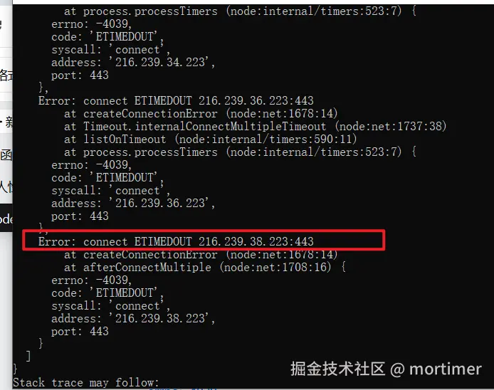 错误日志显示 AggregateError [ETIMEDOUT],明确指出连接 Google 服务器(IP 地址为 216.239.32.223)时超时。