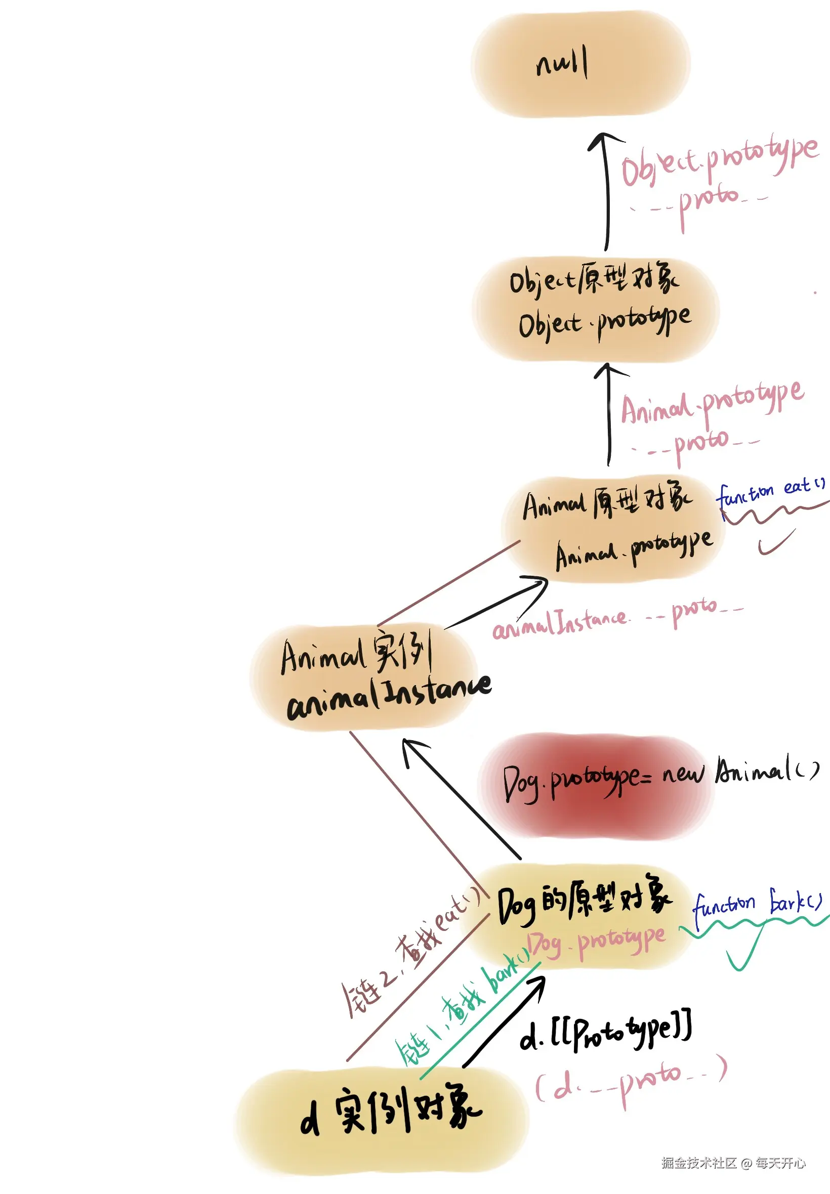 在这个例子中,Dog 的原型指向了一个 Animal 实例,从而实现了继承。