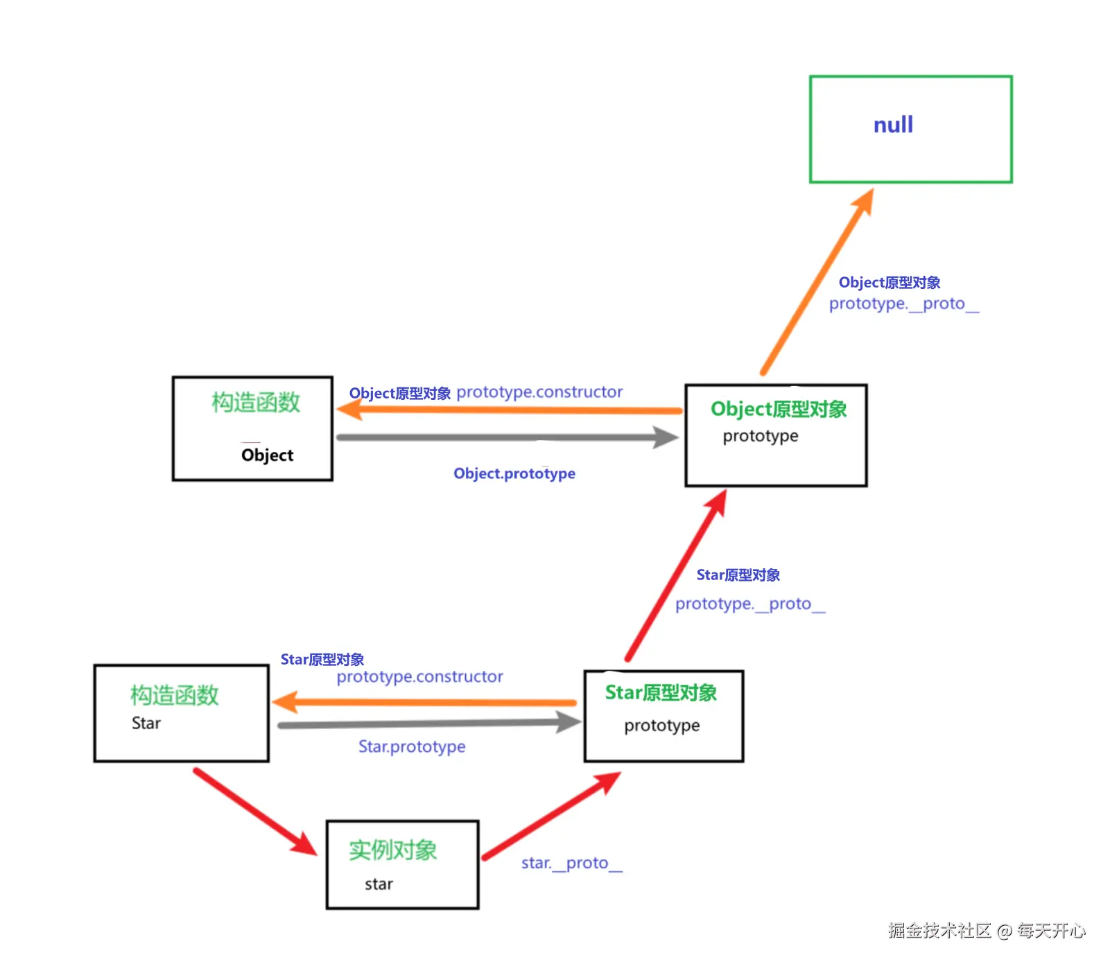 当使用构造函数创建对象时,新创建的对象实例会有一个内部属性 [[Prototype]](通常用 .__proto__表示),它指向构造函数的 prototype 对象。而原型对象本身也可能有自己的 proto,这样就形成了一个链条,直到 Object.prototype,最终指向 null。