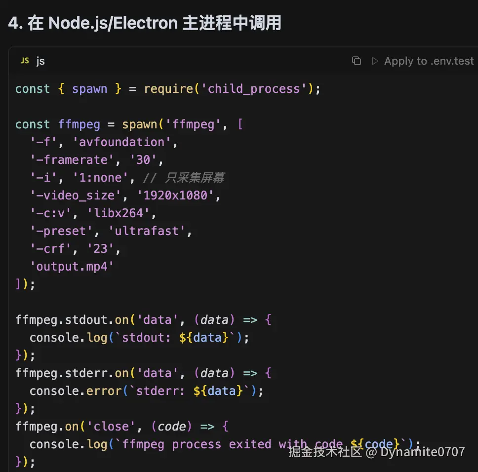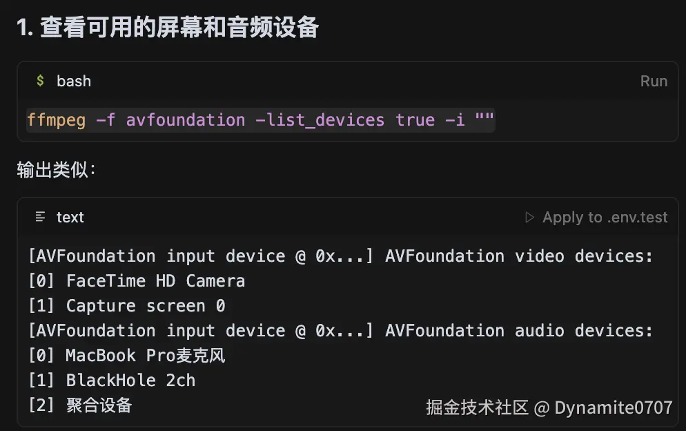 在主进程用 child_process 调用 FFmpeg查看可用的屏幕和音频设备,命令如下: