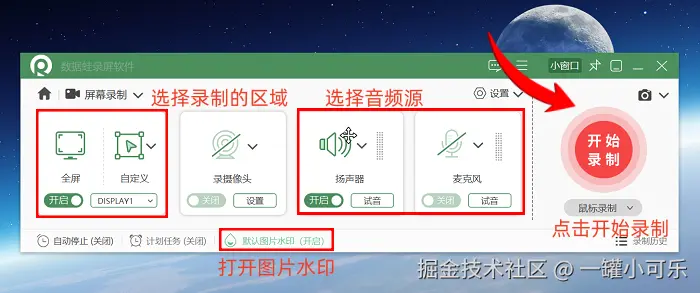 步骤2:选择录制的区域和音频源,还可以自定义 “图片水印” 。设置好后,点击红色的 “录制” 按钮就会开始录屏了。录制时,要是想暂停、继续或者停止,屏幕上都有对应的控制按钮。