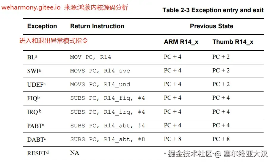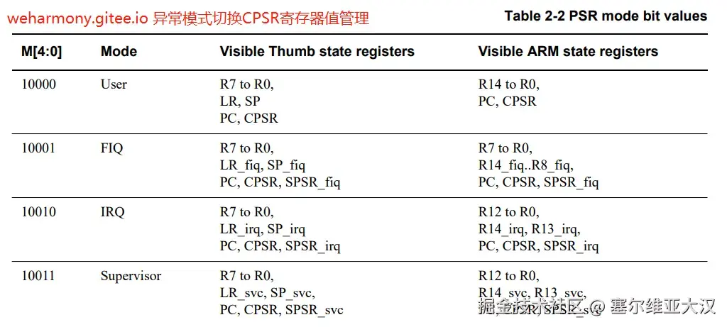 - 一个是代码要切到哪个位置,也就是要重置PC寄存器,每种异常模式下的切换方式如图: