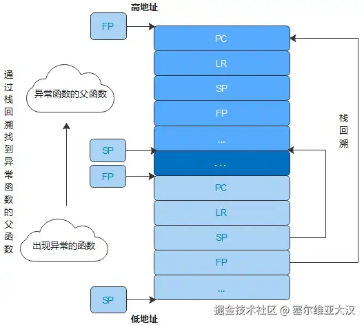 以ARM32 CPU架构为例,每个栈帧中都会保存PC、LR、SP和FP寄存器的历史值。