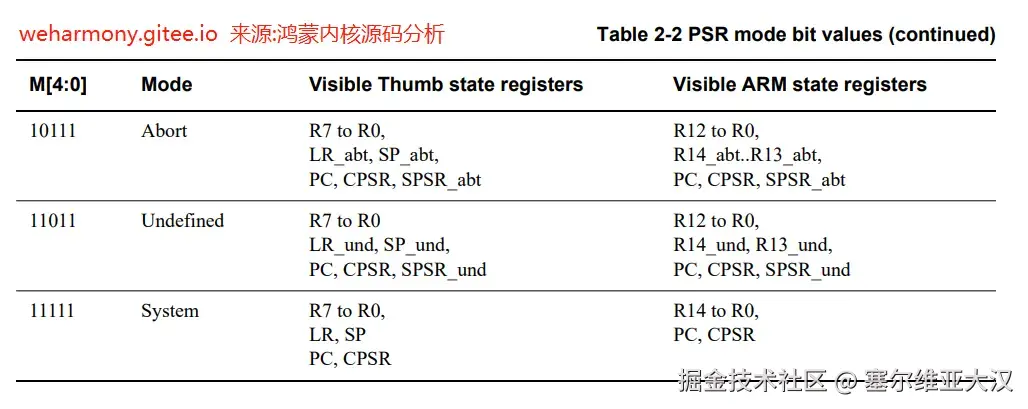 管理模式(svc):操作系统保护模式,CPU上电复位和当应用程序执行 SVC 指令调用系统服务时也会进入此模式,操作系统内核的普通代码通常工作在这个模式下。