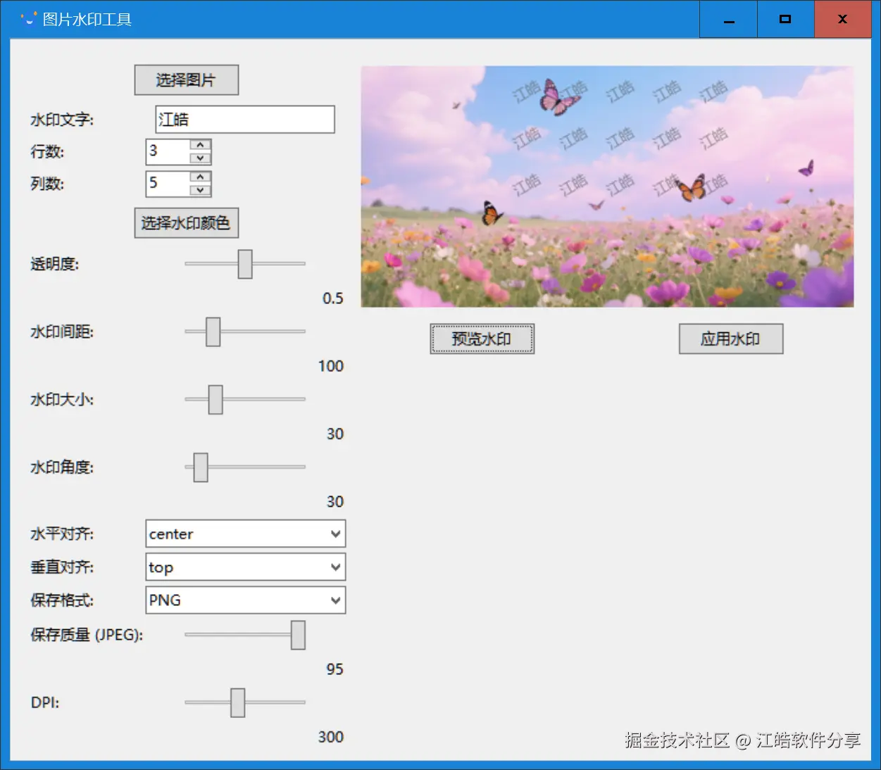 其功能表现十分灵活,可自定义水印的透明度、间距、尺寸与旋转角度,同时支持保存路径的自主选择。