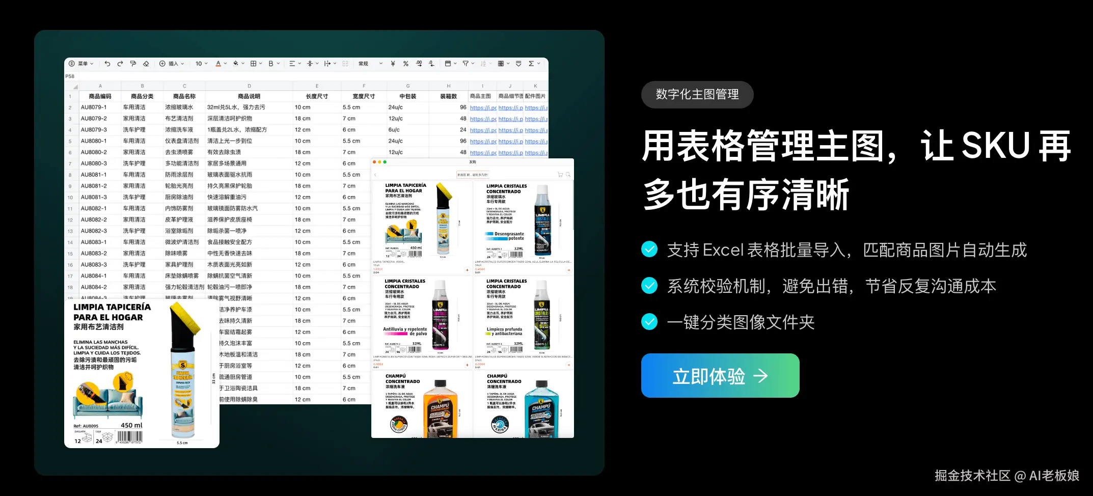 我这边的每款产品都有 SKU 编码、尺寸、中包装、装箱数、名称、材质等信息,一直是用 Excel 管着。ImageTop1 可以把这些字段智能匹配到图里,不用一个个手填。