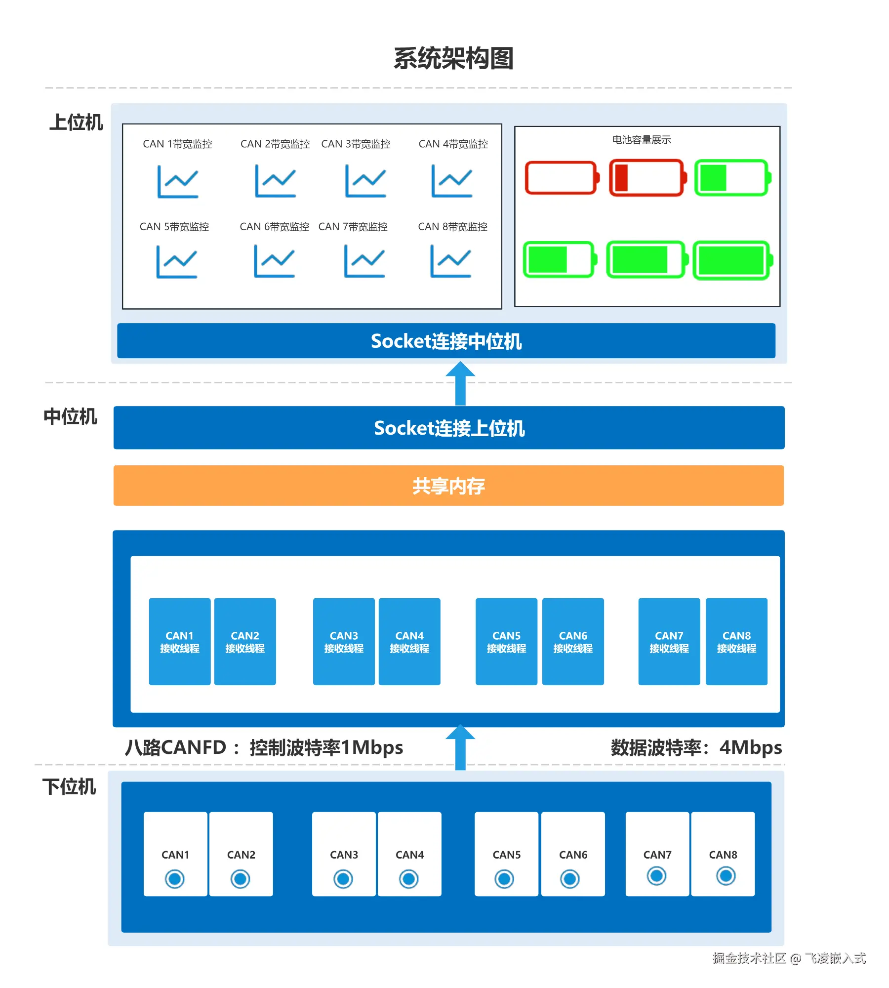 飞凌嵌入式基于FET536-C核心板设计了一套【8路CAN-FD技术展示方案】,它的架构分为下位机、中位机、上位机三级,通过协同工作实现实现8路CAN-FD并行处理。以下是系统框架图以及各层功能详解: