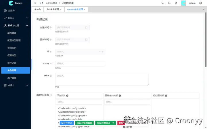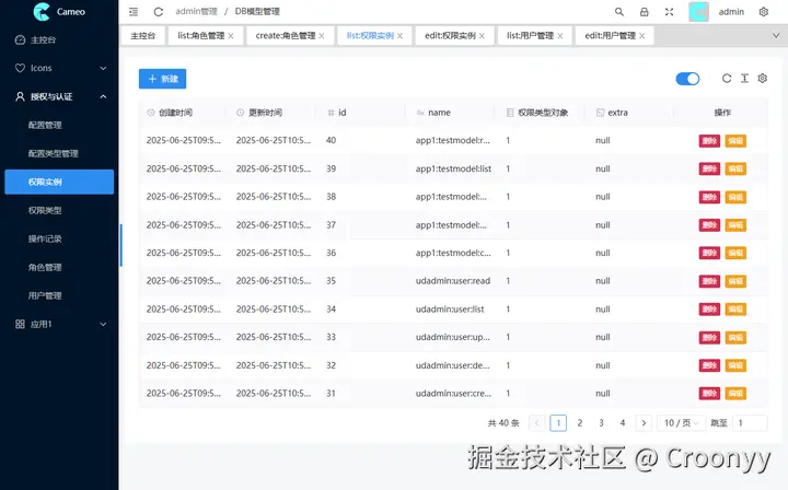 上述步骤结束后,前端会自动生成模型的增删改查页面,管理员可直接看到,其他用户需要定义权限并赋权才看得到,权限格式参考admin应用已有的模型权限