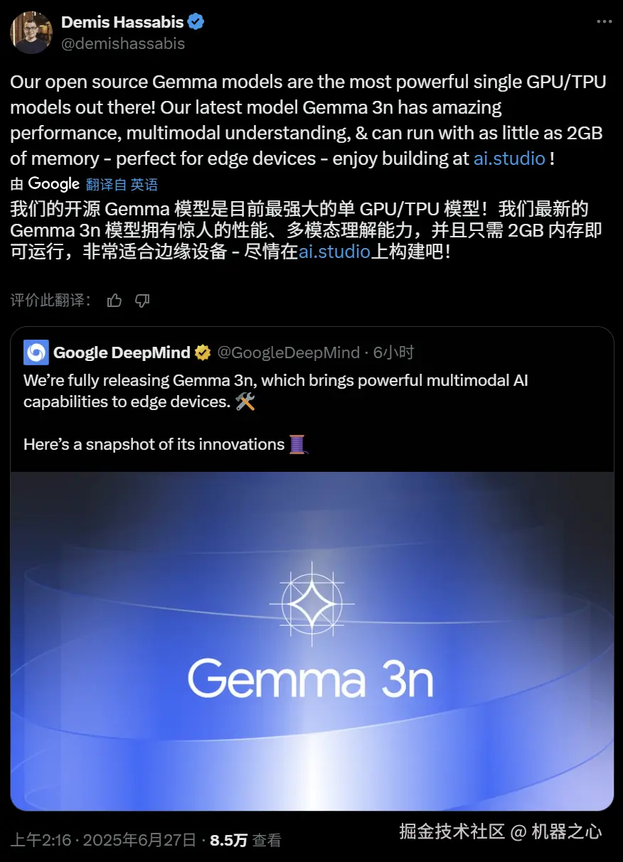 本周五凌晨,谷歌正式发布、开源了全新端侧多模态大模型 Gemma 3n。