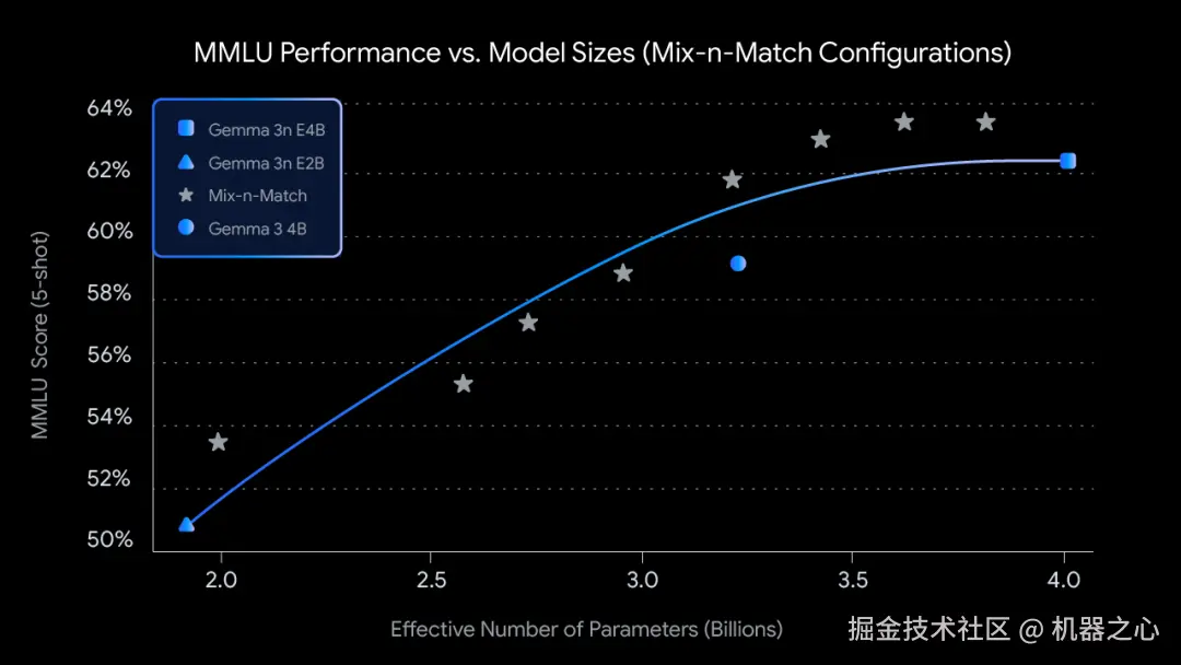使用 Mix-n-Match 自定义尺寸:为了根据特定硬件限制进行更精细的控制,你可以使用谷歌称之为 Mix-n-Match 的方法,在 E2B 和 E4B 之间创建一系列自定义尺寸的模型。这项技术允许人们精确地对 E4B 模型的参数进行切片,主要通过调整每层的前馈网络隐藏层维度(从 8192 到 16384)并选择性地跳过某些层来实现。谷歌还将发布 MatFormer Lab,以展示如何检索这些最佳模型,这些模型是通过在 MMLU 等基准测试中评估各种设置而确定的。