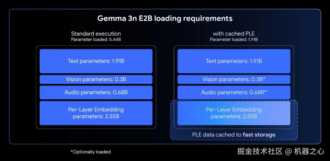 通过每层嵌入,你可以使用 Gemma 3n E2B,同时仅在 AI 加速器中加载约 2B 个参数。