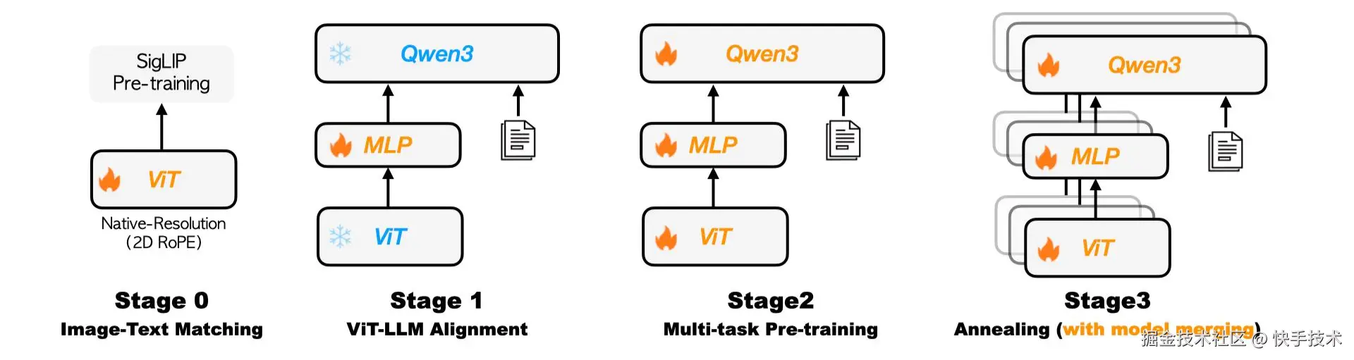 最后,Kwai Keye-VL 探索了同构异质融合技术,通过参数平均融合不同数据配比的退火训练模型,在保留多维度能力的同时,减小模型偏差,增强了模型的鲁棒性。