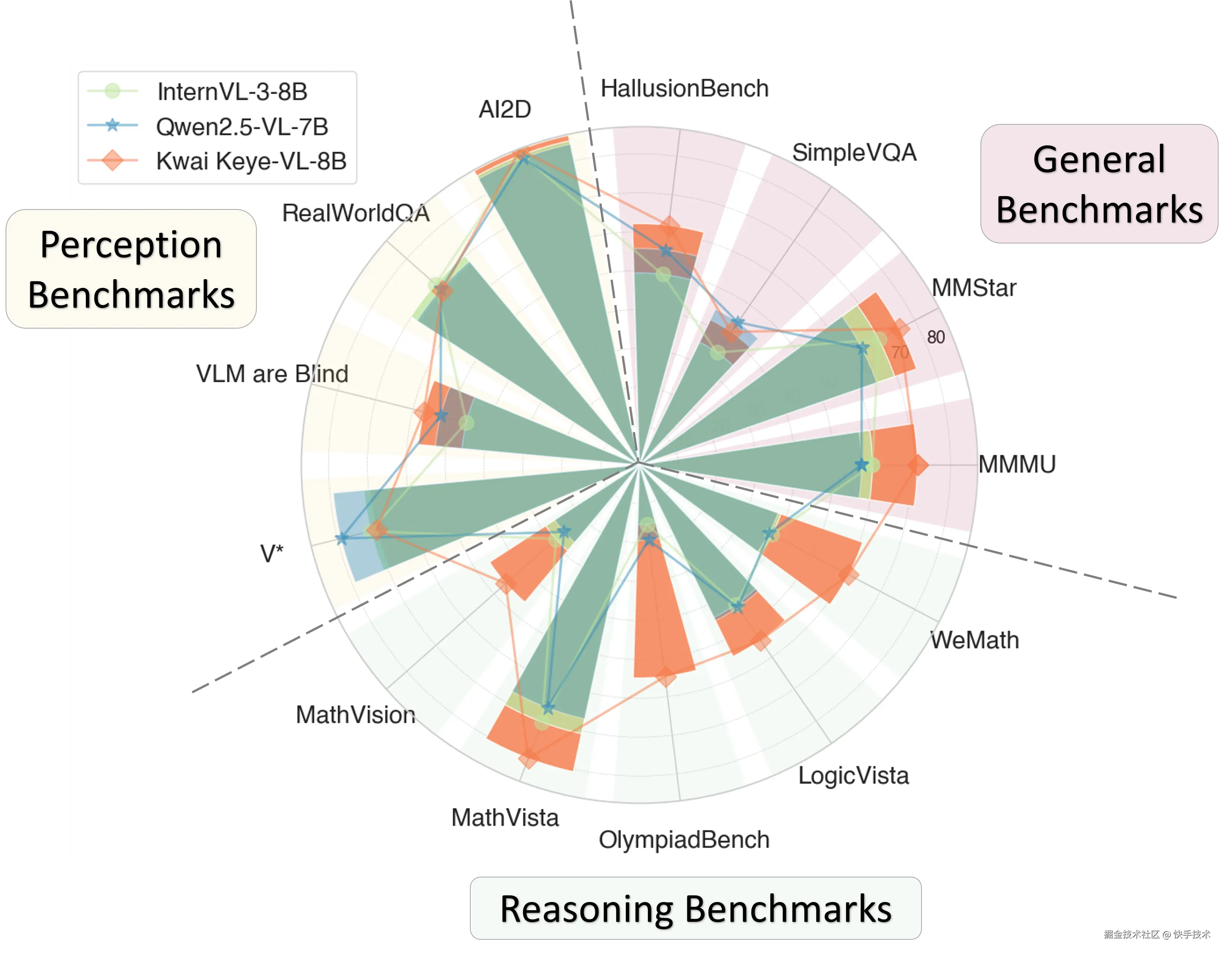 Kwai Keye-VL 在综合感知能力比肩同规模顶尖模型的同时,在复杂推理任务中展现出显著领先优势。