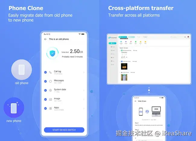 iReaShare Phone Transfer是一款兼容性高的一站式转账程序。您可以使用它将照片、通话记录、联系人、视频、音乐、应用程序、文档等从一部 Android 手机传输到另一部 Android 手机。当然,它也支持iOS和Android之间的数据传输。因此,您可以一次性将 iPhone 数据复制到新的 Android 设备。