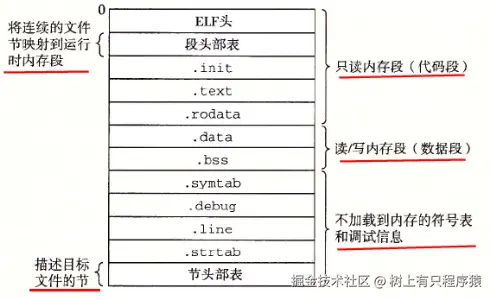ELF头描述了代码段.text、.init、.rodata,数据段.data和.bss的位置,在最初加载可执行文件时,会被率先读取到