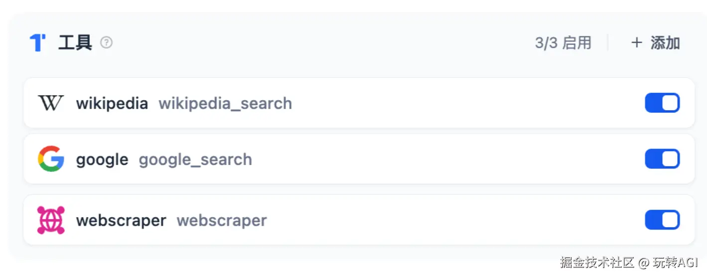 添加工具:Google、webscraper 和 wikipedia 并启用。