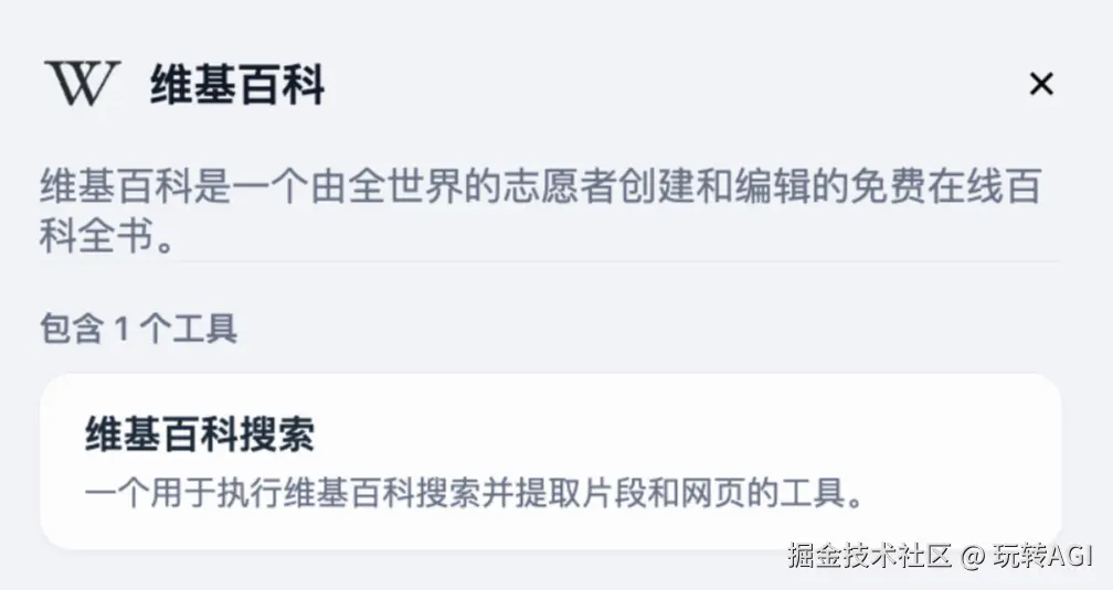 我们还希望 Agent 能够准确介绍目的地知识,Wikipedia 是一个比较好知识来源,Dify 也内置了该工具,无需额外配置。