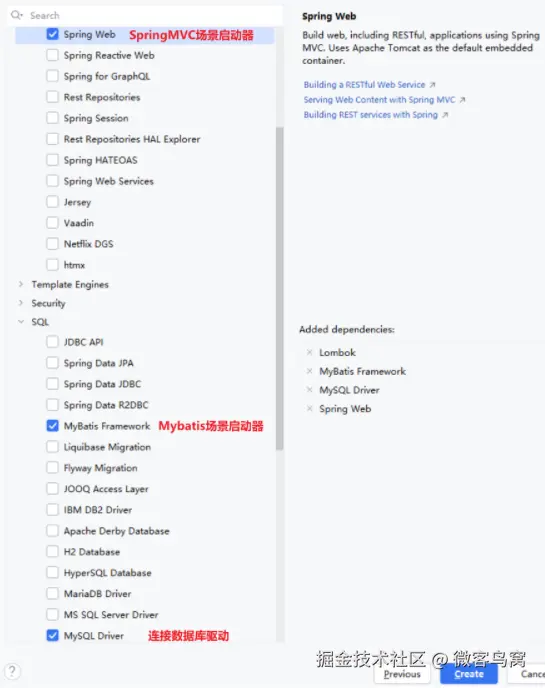 <dependencies> <dependency> <groupId>org.springframework.boot</groupId> <artifactId>spring-boot-starter-web</artifactId> </dependency> <dependency> <groupId>org.mybatis.spring.boot</groupId> <artifactId>mybatis-spring-boot-starter</artifactId> <version>3.0.3</version> </dependency> <dependency> <groupId>com.mysql</groupId> <artifactId>mysql-connector-j</artifactId> <scope>runtime</scope> </dependency> <dependency> <groupId>org.projectlombok</groupId> <artifactId>lombok</artifactId> <optional>true</optional> </dependency> <dependency> <groupId>org.springframework.boot</groupId> <artifactId>spring-boot-starter-test</artifactId> <scope>test</scope> </dependency> <dependency> <groupId>org.mybatis.spring.boot</groupId> <artifactId>mybatis-spring-boot-starter-test</artifactId> <version>3.0.3</version> <scope>test</scope> </dependency> </dependencies> -