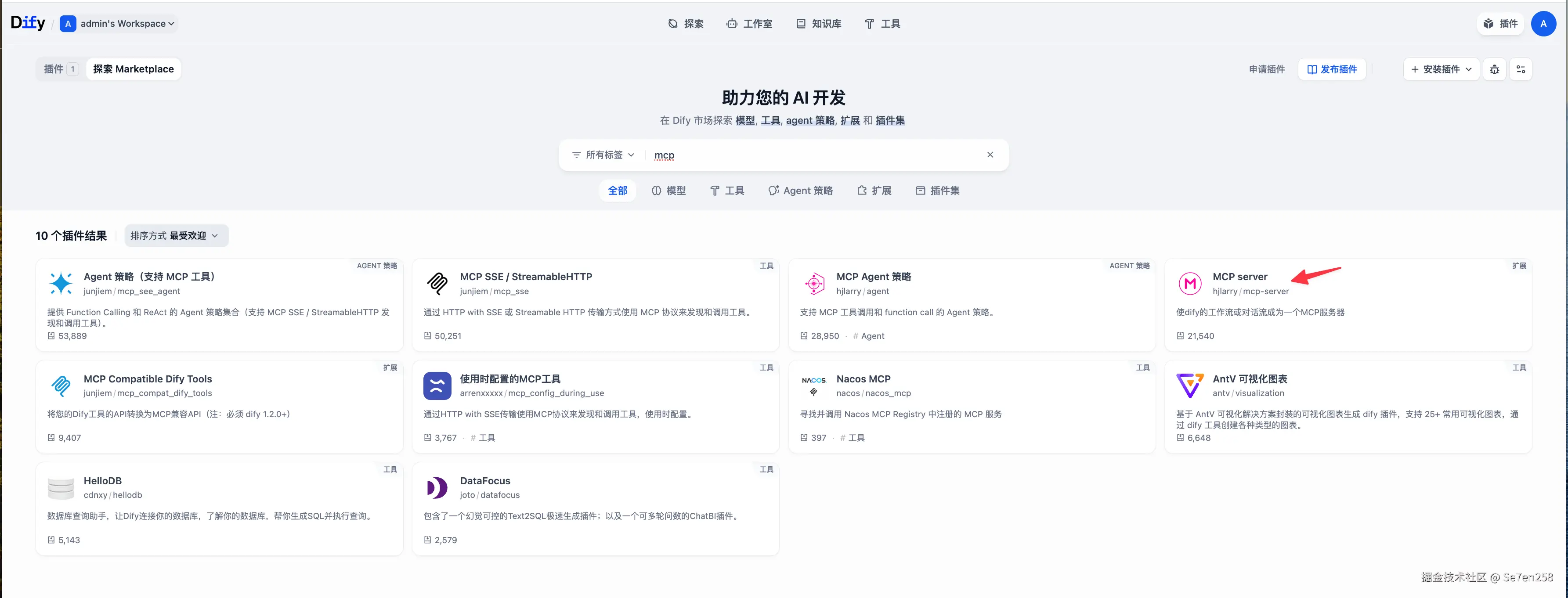 在 Dify 的 Marketplace 中选择 MCP server 插件进行安装。