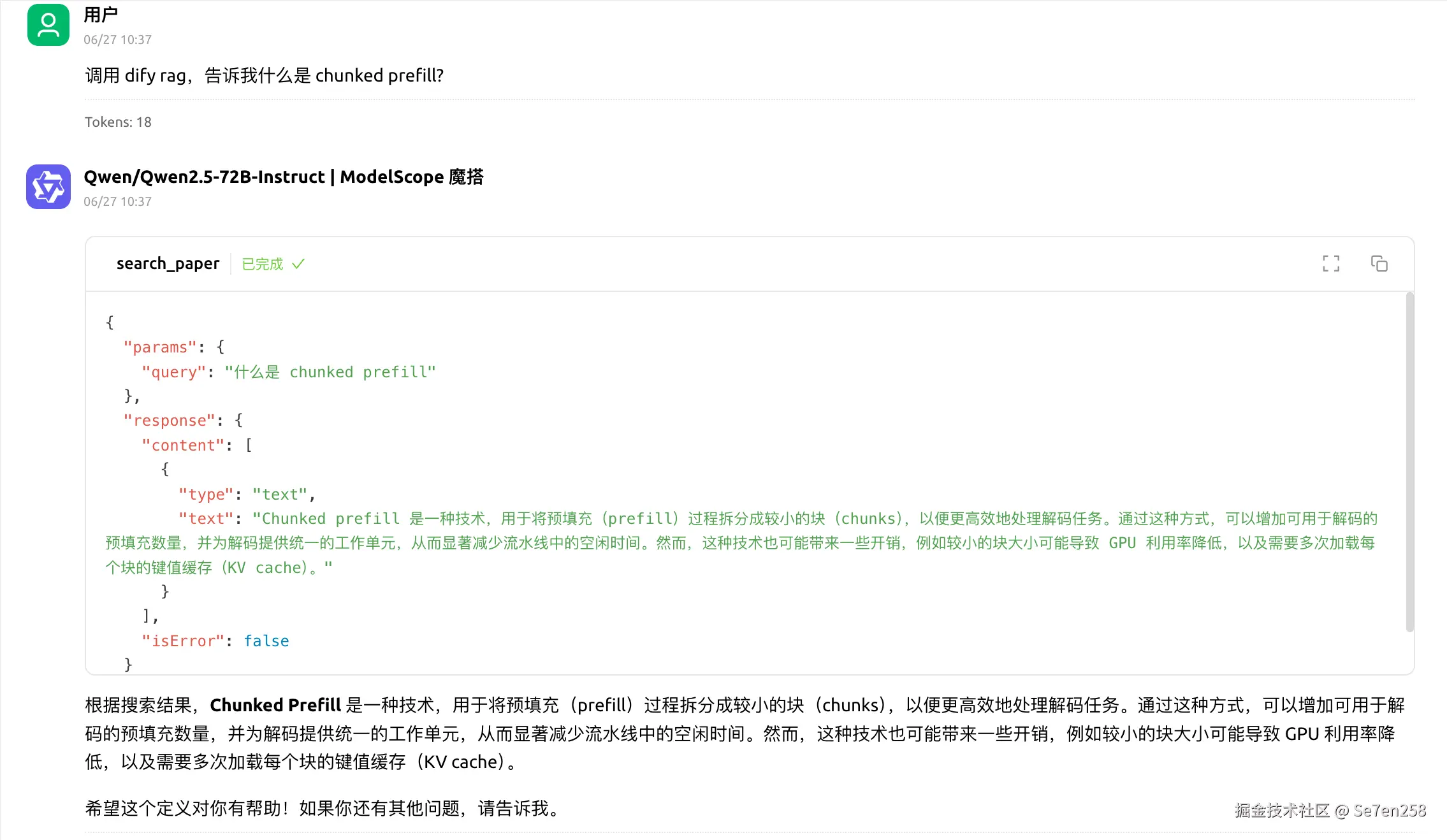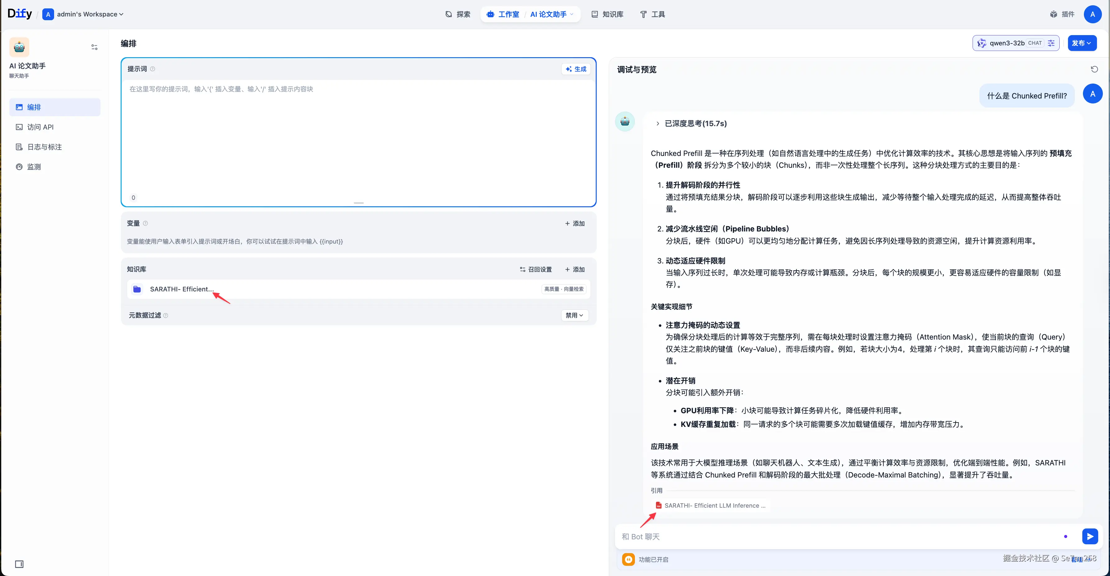 添加上一步索引的知识库作为聊天助手的上下文。然后可以在右侧聊天框里进行应用调试,例如询问什么是 Chunked Prefill?。从输出可以看到,AI 会根据文档内容生成回答,并附上引用的来源片段。