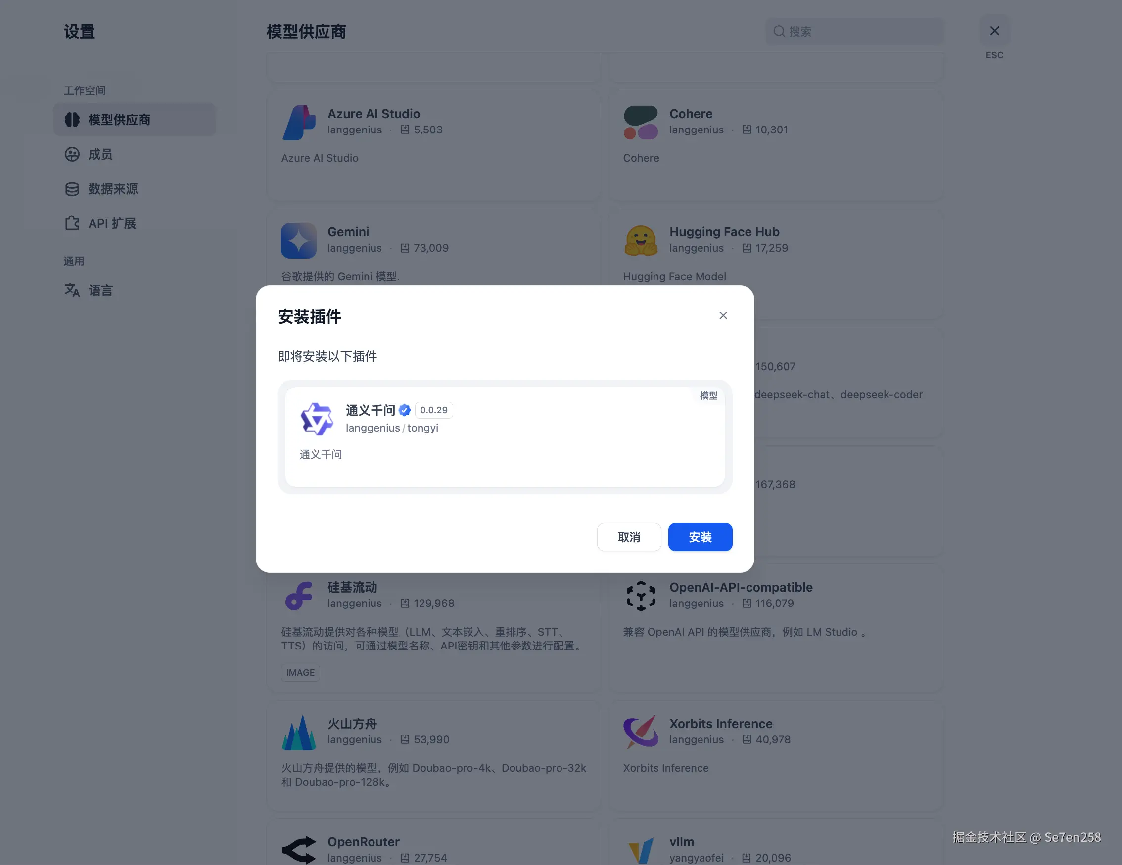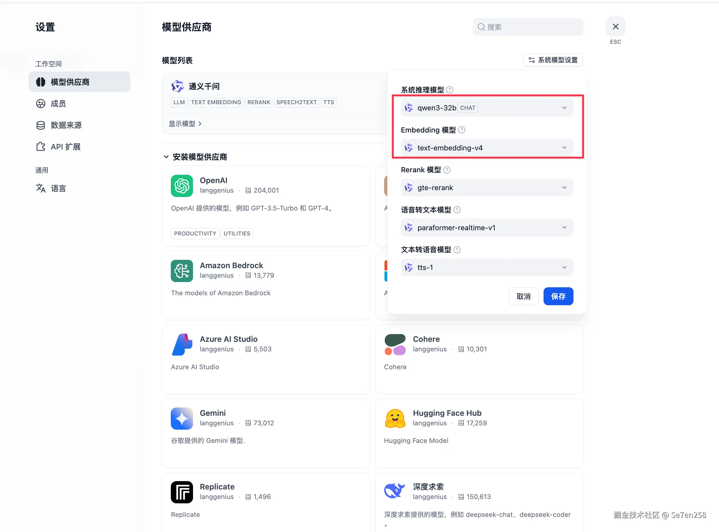 点击模型供应商,这里我选择将通义千问作为模型供应商。读者也可以自行选择其他模型供应商。