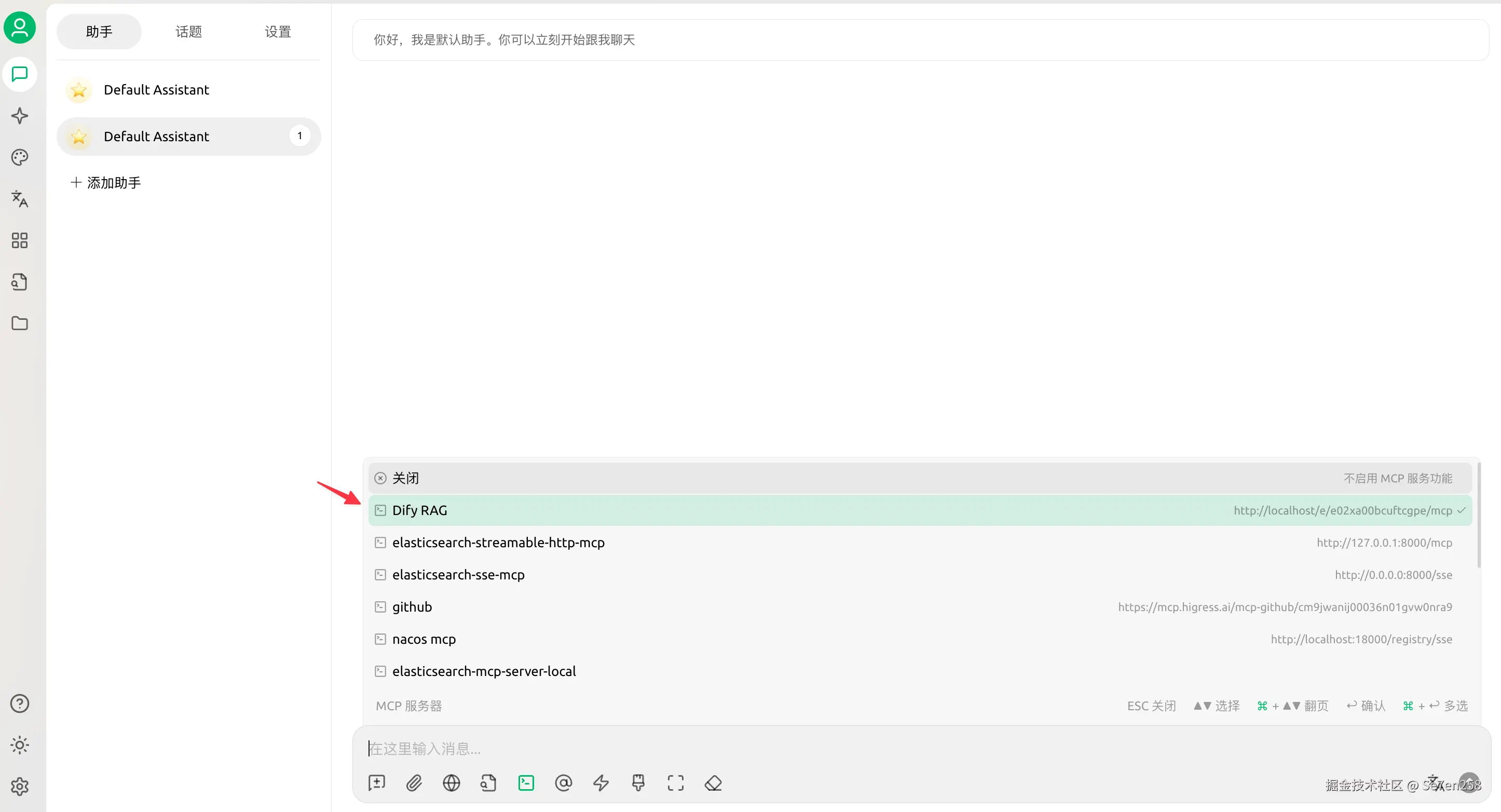 配置完成后,在聊天界面选择配置的 Dify MCP Server。