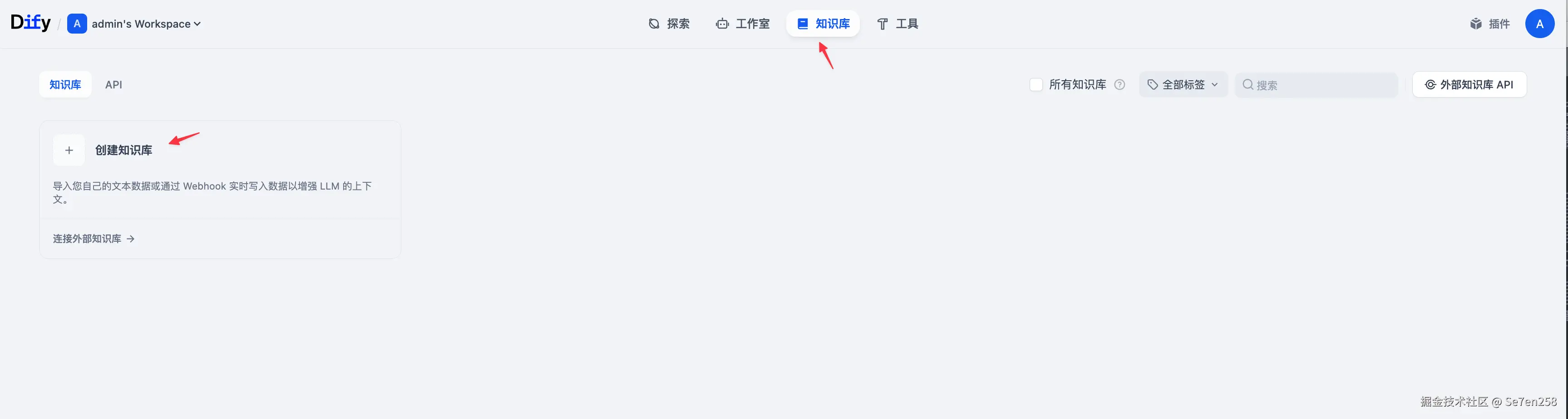 完成模型设置后,接下来可以开始索引知识库了。回到首页,点击顶端的 知识库 标签页,进入知识库管理界面,点击创建知识库。