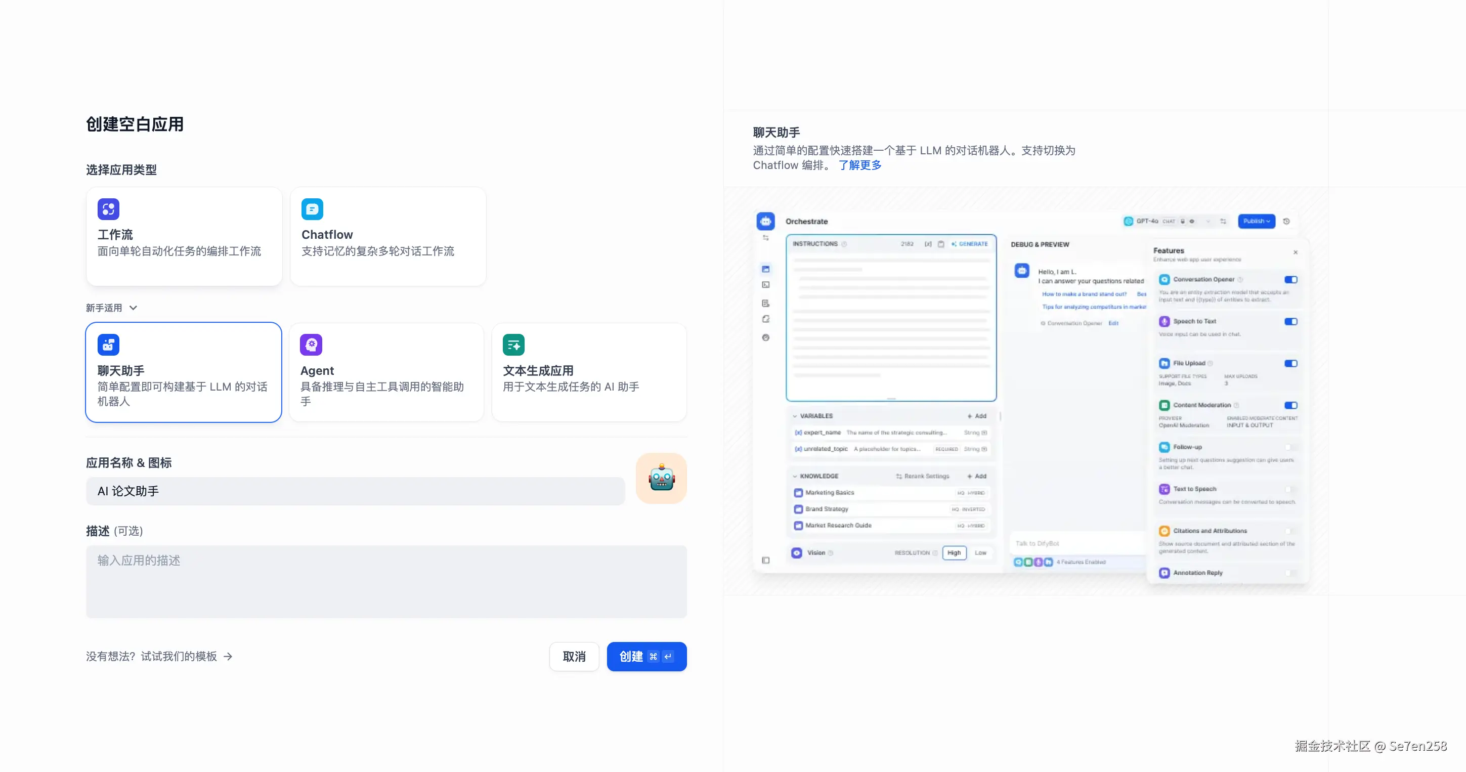 选择聊天助手,并填写应用名称。输入完成后点击创建按钮。