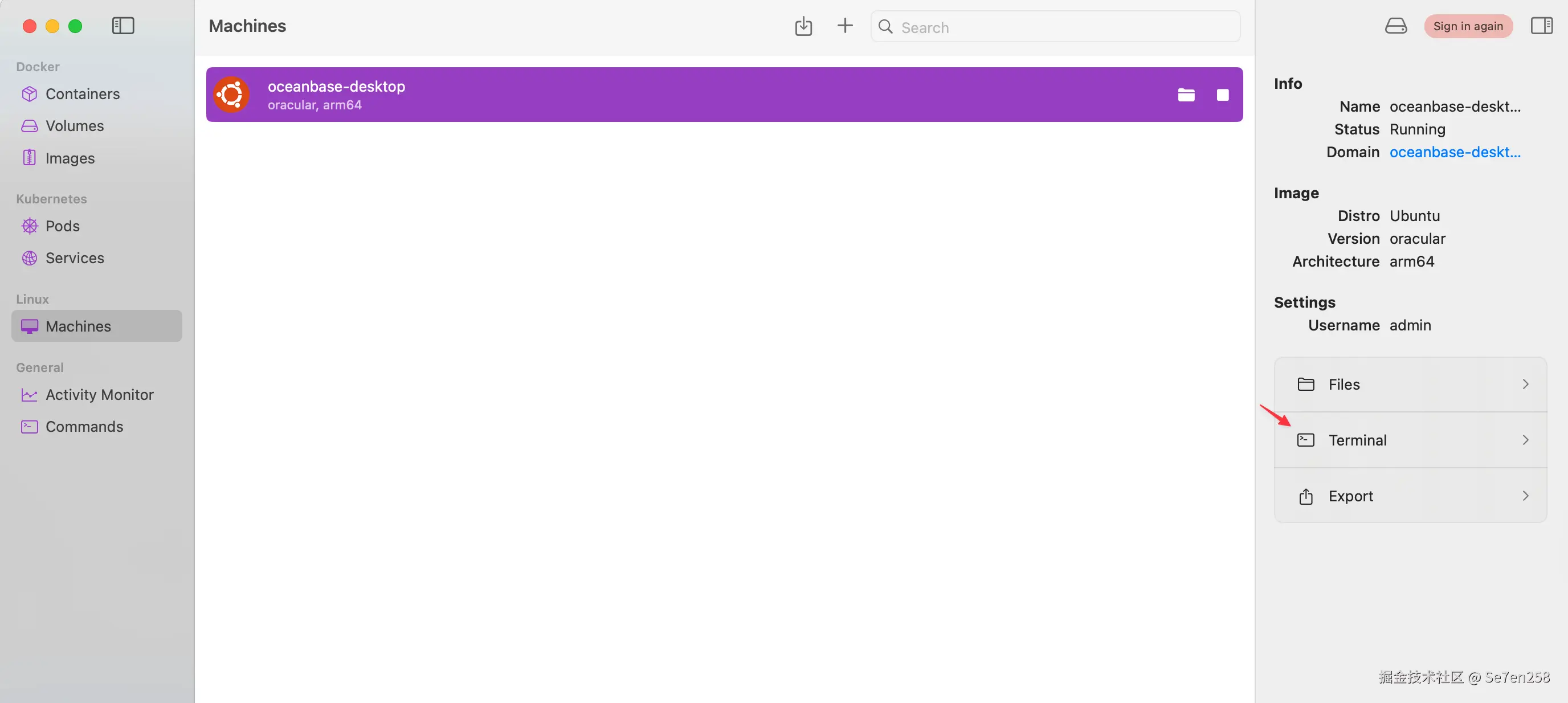 OceanBase 的 IP 地址可以在 OceanBase 桌面版部署所使用的虚拟机中获取。在 macOS 上,OceanBase 桌面版是通过 OrbStack 启动虚拟机进行部署的。你可以在 OrbStack 的 Machines 界面点击 Terminal 按钮进入对应虚拟机,并通过 ip addr 命令查看其 IP 地址。