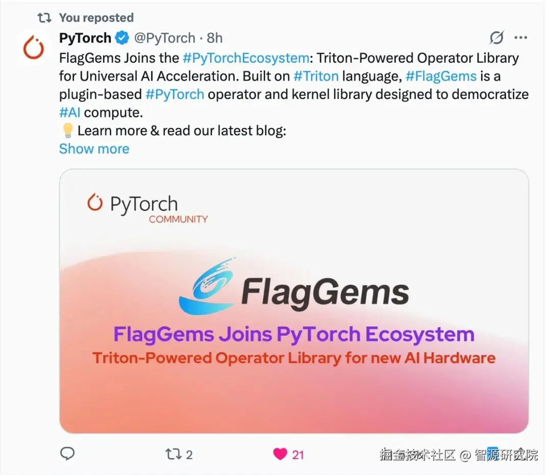 2025年北京智源大会 · PyTorch Day China 论坛上,PyTorch 基金会执行董事 Matt White 宣布高性能通用 AI 算子库 FlagGems 项目获得批准,正式加入 PyTorch 生态项目体系。Pytorch基金会于6月26日在推特上进行了官方宣布。