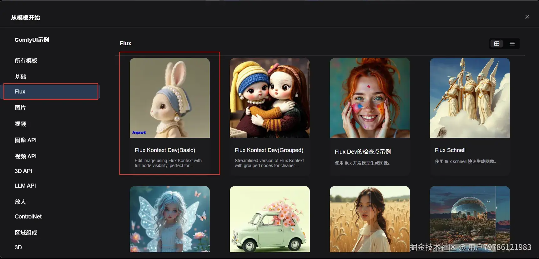 通过菜单-工作流-浏览模版,选择左侧 Flux 标签,点击第一个 Flux Kontext Dev 创建工作流。