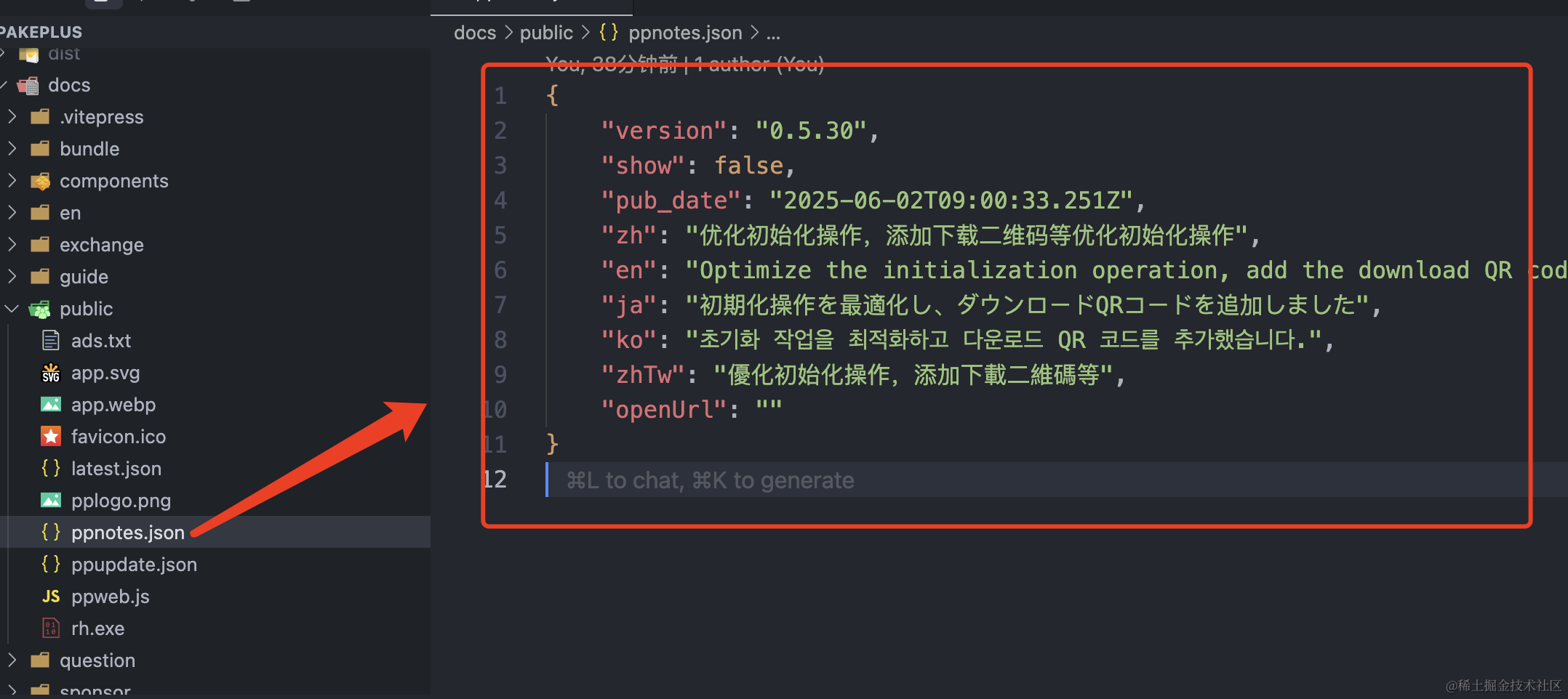 所以在public文件夹中添加一个ppnotes.json的文件,里面的show用于配置是否弹出公告,zh表示公告的内容,支持html文本,openUrl表示当用户点击确定的 时候,自动打开这个url地址,如果为空,就不打开。