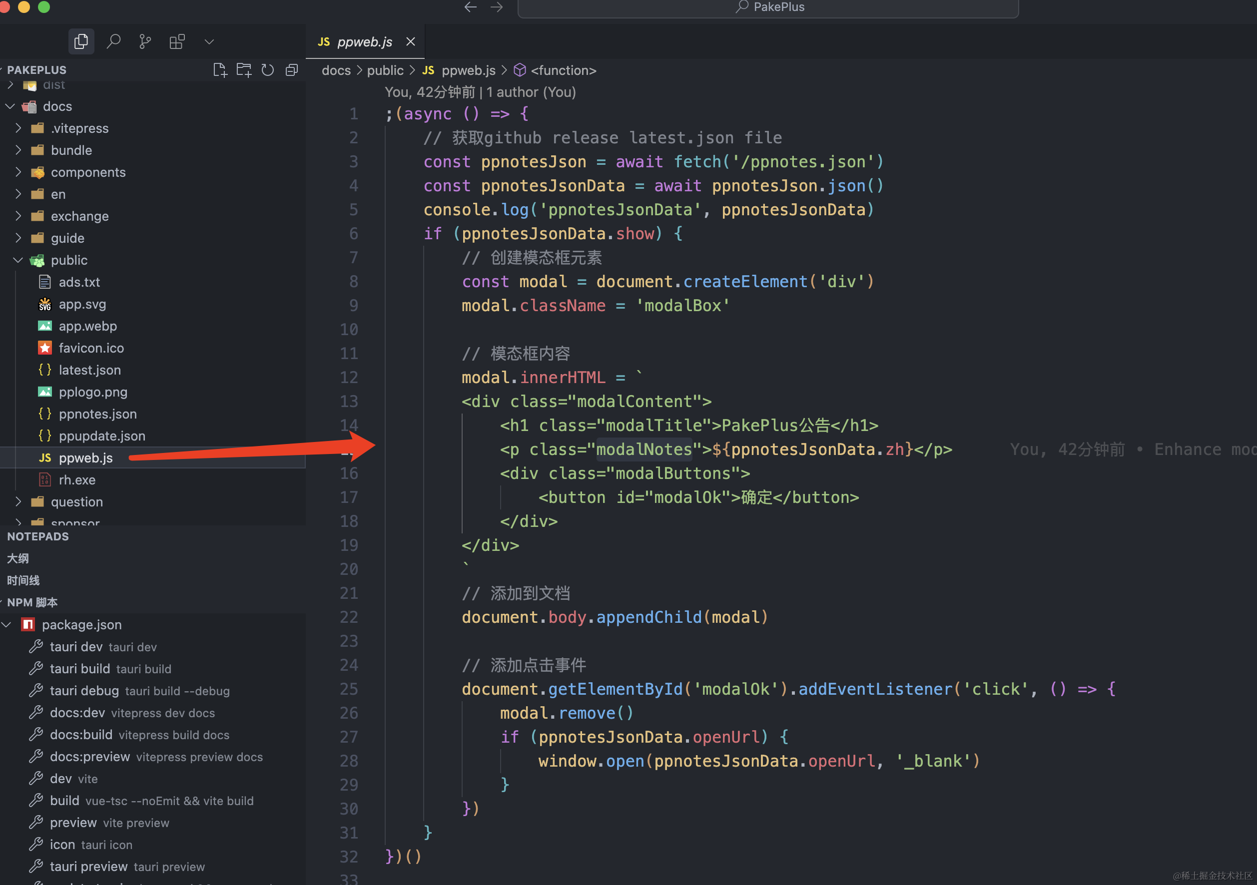 配置好了源文件,就需要用js来控制这个公告的逻辑了,读取这个ppnotes.json文件,并根据里面的配置来确定是否要弹出公告内容和处理url逻辑,这个js文件我们也放在public中,内容如下: