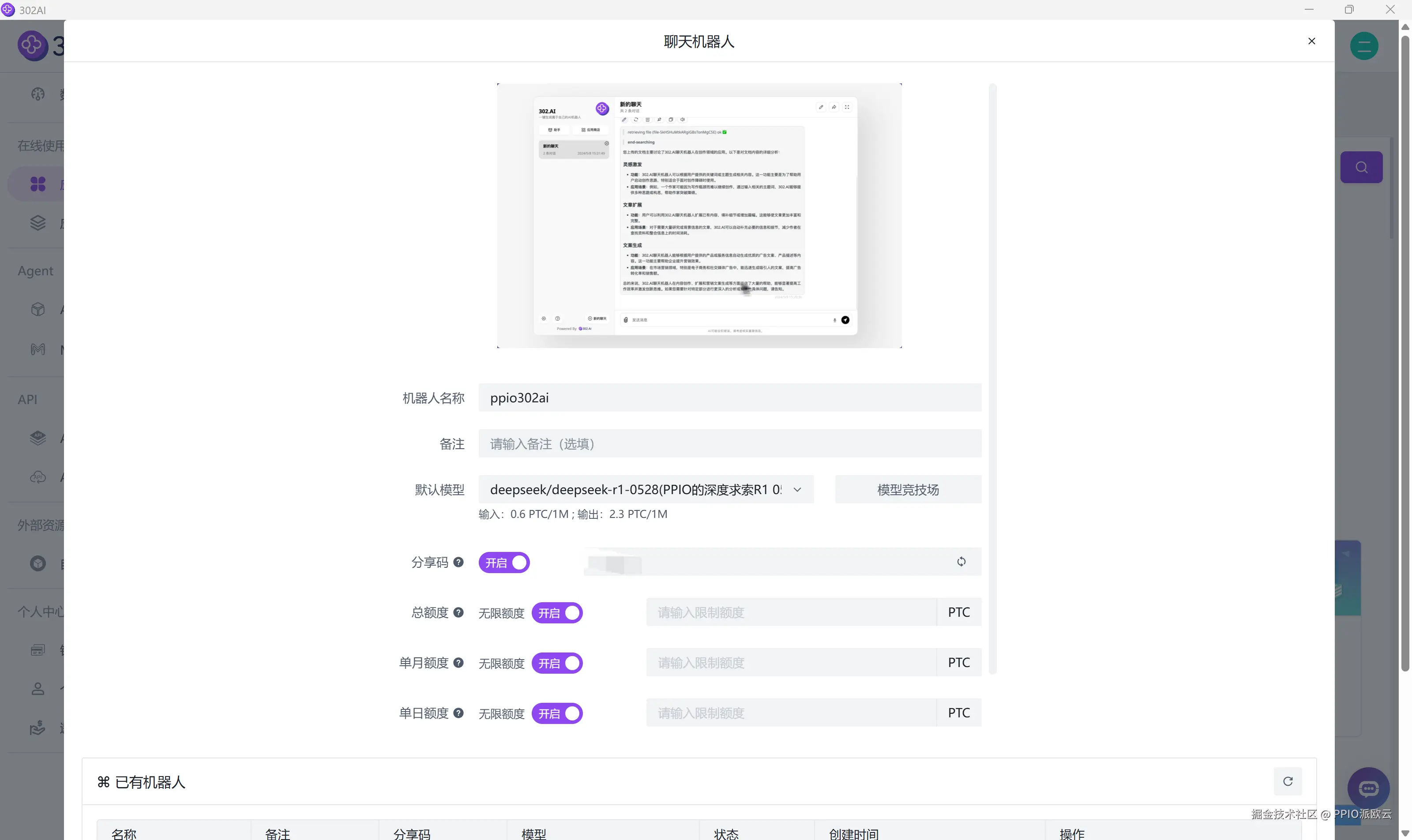 每个聊天机器人每天收费0.05美金,按天计费支付给302.AI,所消耗的token从PPIO账户扣除。